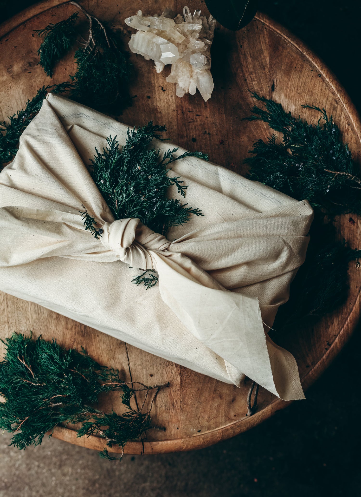 Our gift wrapping is inspired by the Japanese furoshiki method, which is a beautiful technique using cloth. We use 100% muslin cloth with additional sprigs of Juniper tucked in to the fabric to beautify your gift sustainably and lovingly.